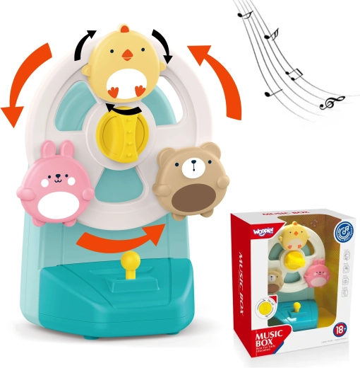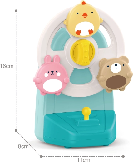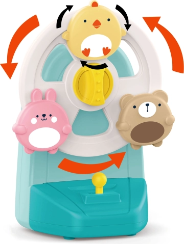 The child easily engages the rotating mechanism using the yellow control knob, watches the animals move, and practices fine motor skills and hand–eye coordination.
