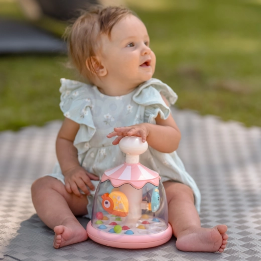 Discover the charm of simple interactive play: just press the large top button and the transparent dome turns into a mini carousel with animals and lively bouncing balls. Children will enjoy the colorful effects, movement, and gentle sounds that naturally develop their senses.
