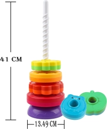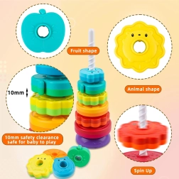- The set includes six rings of different shapes, which can be stacked to create a colorful, spinning pyramid