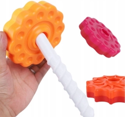 The WOOPIE Spiral Tower is made of colorful elements that are placed on a rod and screwed down. This toy is designed to be durable and safe, ensuring long hours of fun for your child. The set includes 6 rings and a base in different colors and shapes, allowing you to build a tower in various ways. Building the pyramid supports logical thinking and planning next steps.
