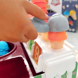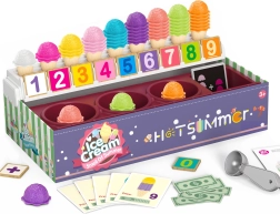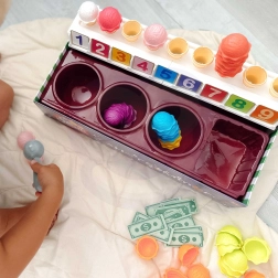 The ice cream shop playset from the brand Woopie not only offers fun while pretending to be a little ice cream seller, but also offers learning numbers, colors, and basic addition. It includes 87 pieces including ice cream scoops, cones, order cards, money, number tokens, and an ice cream scoop.