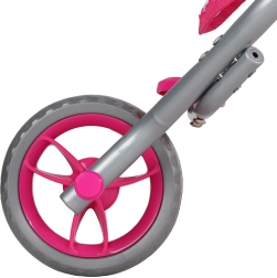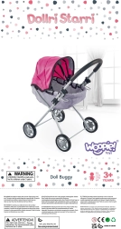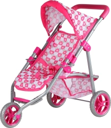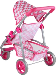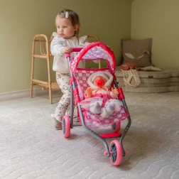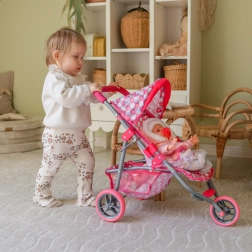 A lightweight and stable three-wheel doll stroller by Woopie, featuring a pink heart design and practical accessories for play at home and outdoors. It has a foldable canopy, safety belts, a soft foam handle, and a bottom basket for small items. Thanks to the quiet foam wheels, it’s easy to steer, and after play you can fold it quickly to save space.
