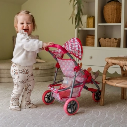 This pink three-wheel doll stroller is ideal for children aged 3 and up who love realistic family play. The lightweight yet sturdy metal frame and easy handling ensure safe, smooth rides both indoors and outdoors. The stylish heart-patterned fabric will delight every little caregiver and is easy to maintain — the covers can be removed and washed.