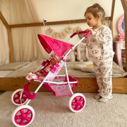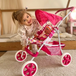 The stylish WOOPIE Royal doll stroller charms with its light and stable frame, foldable canopy, soft foam handle, and quiet foam wheels. It offers straps for safe “rides,” a footrest, and a practical basket for small items. It folds easily to save space and is ideal for play at home and on walks.