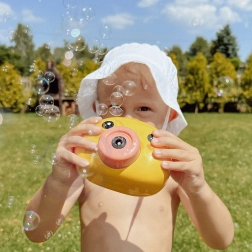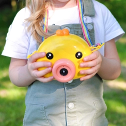 Thanks to the integrated fan, bubbles fly farther and last longer, while melodies and light effects amplify the joy of play. The practical strap lets kids wear the toy safely around the neck, and the solution container makes refilling quick and easy.