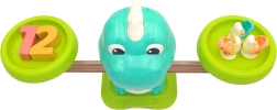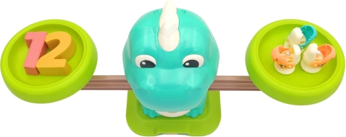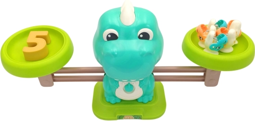Number weights 1–10 match the count of dino figures. Children see when the scale is balanced and intuitively grasp addition and subtraction.