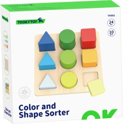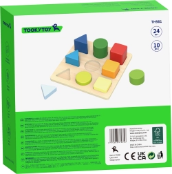 The wooden puzzle from TOOKY TOY teaches children to recognize shapes and colors and develops fine motor skills, logical thinking, and hand–eye coordination. The child inserts 9 colorful pieces — triangles, squares, and circles — into the correct slots on the board. Great fun and training of memory and concentration for the little ones.