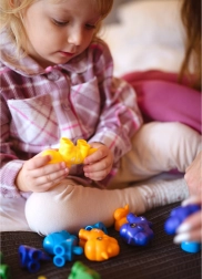 A child and a parent can play together with colorful, connectable plastic toys shaped like unicorns, which supports the development of coordination skills.