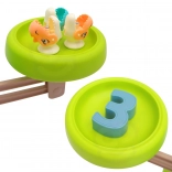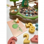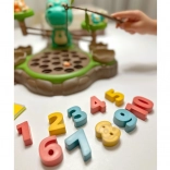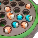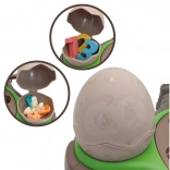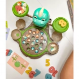The Dinosaur with Weighing toy by WOOPIE offers children the chance to explore the world of numbers and math operations during the fun game of dinosaur catching. The base features a rotating plate where small dinosaurs can be caught. By pressing a button, the plate starts to rotate and the music accompanies children while playing. Behind the plate, there is a large dinosaur serving as scales, and a place for the catching rods, which can be decorated with leaves from the set. On the sides, there are two closable eggs to store the caught dinosaurs.