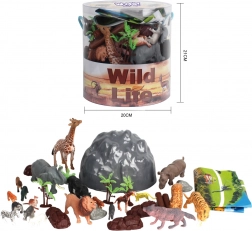 - Animal figures, accessories (trees, rocks), safari-themed map, storage bucket