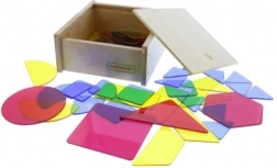 The set of transparent colored plates of various shapes provides easy and simple learning of geometric shapes. The pieces are made of durable acrylic in precise colors, which also allows children to gain knowledge about color mixing, e.g., red + yellow = orange. Ideal combination with the LED light board Masterkidz Education. The set comes in a sturdy wooden case, which makes storage easy.