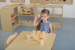 Another feature of the toy is the ability to fill the empty block with any material, such as sand or pebbles, to determine the sound produced when shaken. The toy is ideal for children's approaches according to Montessori.