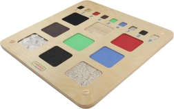The MASTERKIDZ sensory board is designed for playful exploration of the world through touch. With guided supervision from a teacher or parent, children search for matching pairs of textures while blindfolded and describe their properties. This develops tactile perception, vocabulary, and the ability to concentrate. The wooden construction is durable and environmentally friendly.