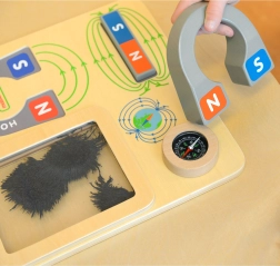 This robust wooden board nurtures curiosity and supports understanding of basic physics. Children can experiment with magnetic attraction and repulsion, observe field lines in iron filings, and explore cardinal directions using the compass. Everything is clearly illustrated and safely built into the panel, making learning clear and fun.