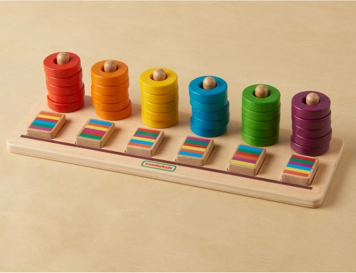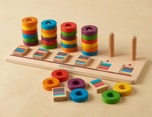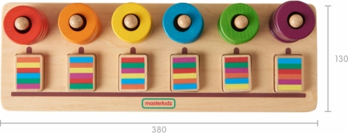 This educational board is a perfect puzzle for children from 2 years. The set includes 30 colorful rings (6 sets of 5 pieces in similar colors) that can be used for play, learning colors, sorting, and sequencing. Children can arrange the rings in a given order or create their own sequences. The spaces in front of the rods allow for building sequence blocks, which presents a challenge and develops concentration, spatial awareness, logical thinking, and color recognition.