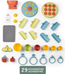- 29 accessories included, e.g., chutes, cups, paddle wheels, balls, to inspire creative play.