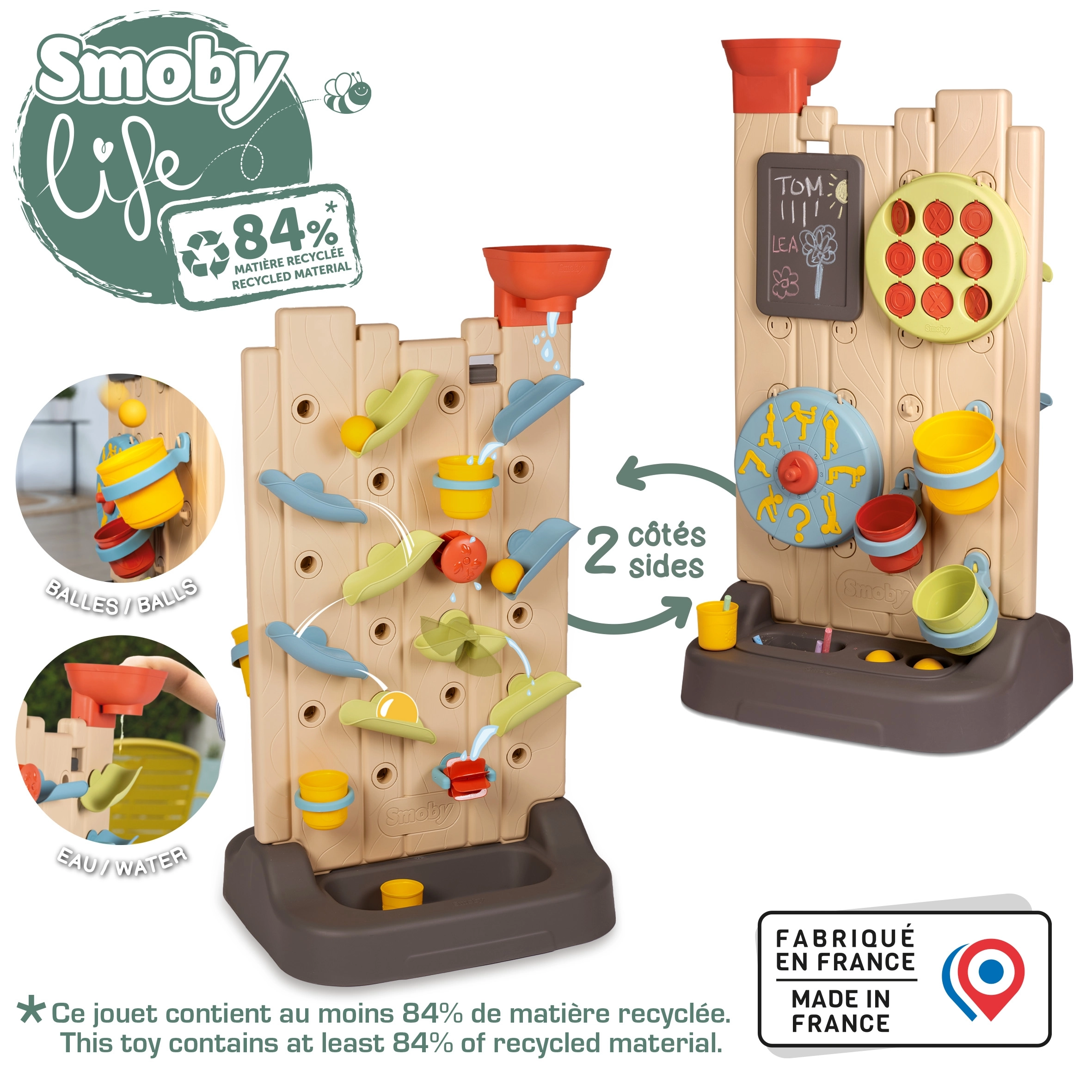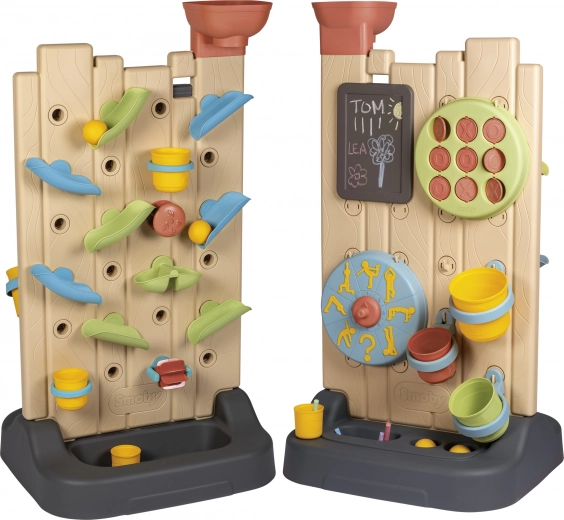 - Includes 6 activities: water play, tic-tac-toe, chalk board, sports wheel, ball toss, and interactive elements for creating your own water tracks.