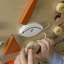 The board is easy to use mounted in a wall frame or freestanding on a table or floor. It is robust, safe, and ideal for a Montessori approach to learning through sensory and practical activity.