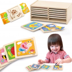 This set includes 12 wooden boards, each with 4 puzzle pieces. Your child can improve their fine motor skills and logical thinking by placing the correct pieces on the corresponding boards. Bright colors and cute illustrations captivate young users and make playtime joyful.