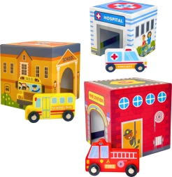 The WOOPIE GREEN nesting city is a creative alternative to classic building sets. Five illustrated cardboard blocks depict familiar city buildings (e.g., fire station, school, hospital, police station) and are numbered from 1 to 5 for easy learning of counting and sizes. Special cutouts in the blocks allow you to insert and store the vehicles, so children can create their own stories and scenes from city life.