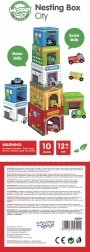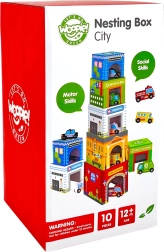 Discover playful learning with the WOOPIE GREEN nesting city – colorful stacking blocks featuring city buildings and numbers, complemented by wooden vehicles on rubber wheels. Children from 12 months practice fine motor skills, logical thinking, and exploring the city world by building towers, inserting cars into buildings, and playing out stories.