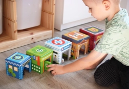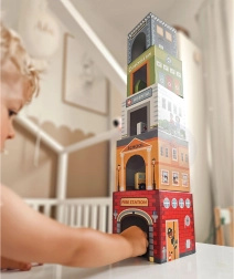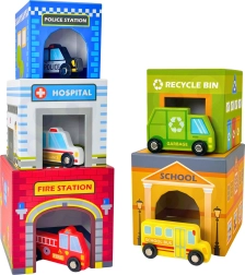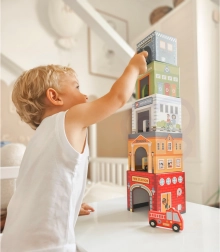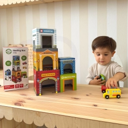 Five numbered blocks with cutouts let kids build towers, place vehicles inside, and explore the city through play – perfect for developing imagination.