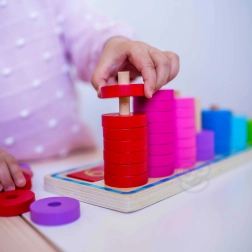 Children match colored rings to numbers and intuitively learn to count, recognize colors, and understand the concepts of more–less.