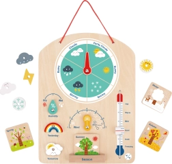 Children use rotating dials to record the current weather, temperature, and season. A great ritual for morning and evening chats and for building vocabulary.