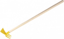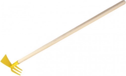 Garden tools for children, such as this double-sided hoe with a yellow handle, turn work in the garden into fun. It helps develop motor skills and motivates children to spend time in the fresh air.