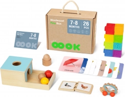 Tooky Toy Montessori Box for children aged 7-8 months contains 6 sensory and didactic toys that support healthy psychomotor development and stimulate the senses. It helps develop logical thinking and hand-eye coordination. An ideal gift for your child.