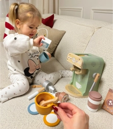 Fun in the café offers a great opportunity for learning through play! The set from the brand Woopie Green allows children to play as little baristas with 25 elements, including a coffee maker, cups, capsules, and milk. Made from natural wood and painted with safe colors, it ensures a realistic appearance and safe fun.