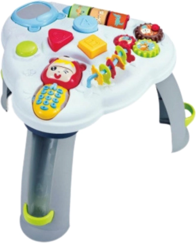 An interactive educational table for little ones that combines fun and learning in one. Thanks to light effects, sounds and melodies, and numerous moving elements, it develops fine motor skills, hand–eye coordination, and logical thinking. It includes an interactive battery-powered phone, colorful buttons, rotating wheels, and shape-sorting pieces – an ideal choice from around 6 months.