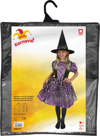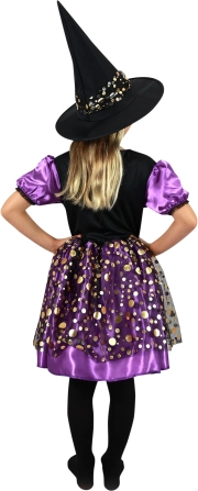 An adorable and eye‑catching kids’ witch costume in a purple‑black design with a gold print and a perfectly matching hat. Ideal for Halloween, carnivals and costume parties. Size S for ages 4–6 (105–116 cm).