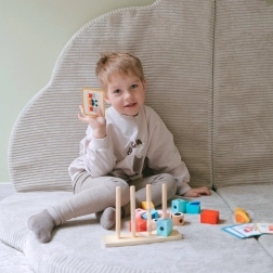 The set includes 18 pieces: a wooden base, 12 shaped blocks, and 5 double-sided cards with templates. Children can build according to the patterns or create their own combinations—from simple towers to fun “animal” compositions. Safe, non-toxic paints and quality wood ensure long-lasting use and a comfortable grip for small hands.
