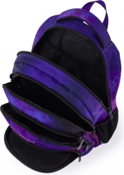 This stylish school backpack with a galactic motif combines attractive design with smart ergonomics. The three-compartment layout holds textbooks, notebooks, and snacks, plus it includes an internal pocket, an organizer for small items, and a laptop sleeve. A side bottle pocket and a holder for keys/card make everyday use easier.