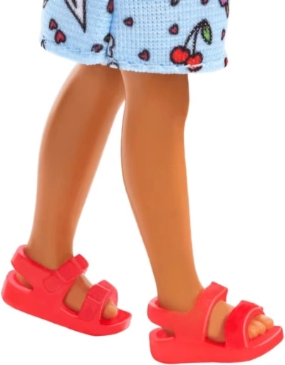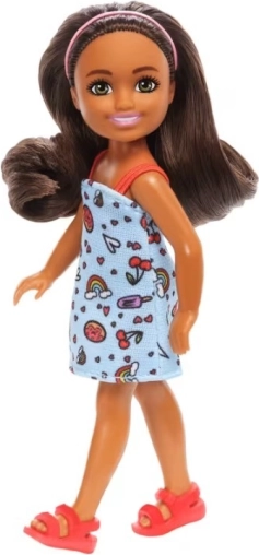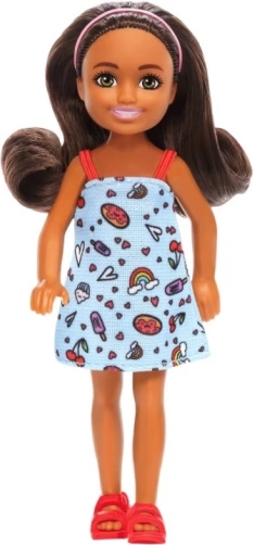 The doll stands out with a blue printed dress featuring rainbows, hearts, and treats, long brown hair with a pink headband, and red sandals. You can combine her with other Chelsea dolls and accessories (sold separately) for even more fun.