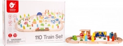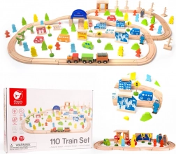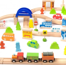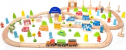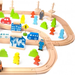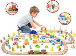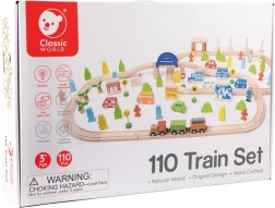 Discover a large wooden train set with 110 pieces from CLASSIC WORLD. The colorful set with tracks, a bridge, buildings, vehicles, and figures supports fine motor skills, hand–eye coordination, and creative play. Safe natural materials and long-lasting durability make this train set a great gift for children aged 3 and up.