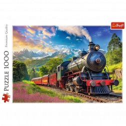 Train Journey Puzzle with 1000 pieces depicting a steam train racing through the mountains. Once completed, the picture measures 683 x 480 mm.