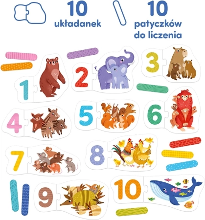 This colorful educational set is ideal for preschool-age children who are getting to know numbers. Each two-piece puzzle features animal illustrations and the corresponding numeral—the task is to match them correctly. Thanks to the counting sticks, you can enrich learning with additional playful activities and strengthen understanding of quantity.