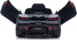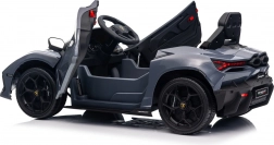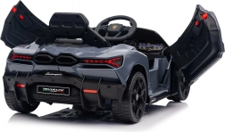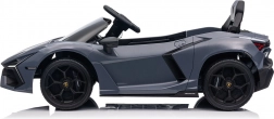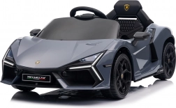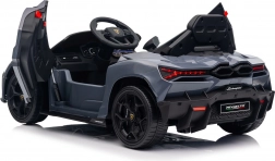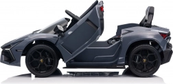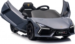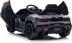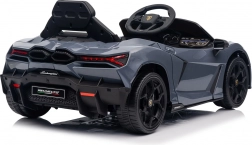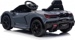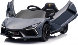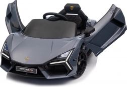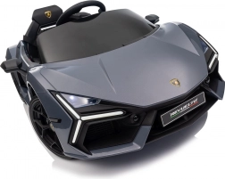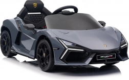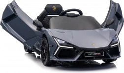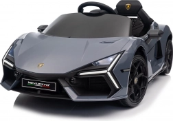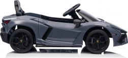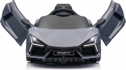 Stylish kids' electric ride-on car LAMBORGHINI Revuelto in an elegant gray color delivers a realistic driving experience. Powerful drive 2×45 W, battery 12 V 9 Ah, soft EVA wheels, opening scissor doors, and a comfortable eco-leather seat with belts. For parental safety, there is a 2.4 GHz remote control with a Stop button. Includes LED lights and rich audio features with Bluetooth/MP3/FM/USB.