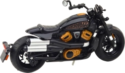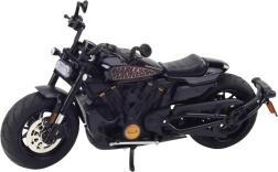 A stylish metal chopper model in 1:12 scale will delight collectors and motorcycle enthusiasts alike. It offers precisely crafted details, a combination of metal and durable plastic, and an attractive black design with gold accents. For an enhanced experience, it features light and sound effects, rotating wheels, steerable handlebars, and spring suspension.
