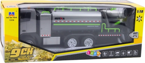 Realistic 1:18 RC tanker with a water sprayer, 9-channel control, and a stable 2.4 GHz radio system. Offers light and sound effects, an automatic demo mode, and quality metal and plastic construction for long life.