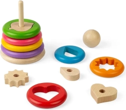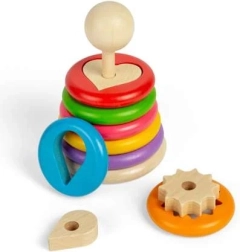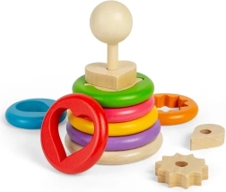 This original stacking toy brings seven wooden rings, each hiding a different shape – for example a heart, star, leaf, or gear. Children first match the correct shape to the ring and then thread the whole piece onto the wooden rod. A fun way to grasp shapes, sizes, and spatial perception.