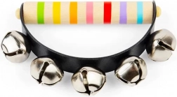 Cheerful jingle bells with a wooden handle bring babies their first musical experiences from birth. Five metal bells on a flexible strap create gentle rhythmic sounds that support auditory perception, coordination, and fine motor skills. The ergonomic, smooth handle is easy for little hands to hold, and the colorful striped design stimulates visual attention. The toy is made from high-quality, responsibly sourced materials and meets European safety standards.