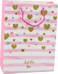 Gift bags are equipped with comfortable string handles in pink and blue, allowing for easy carrying. Each bag is adorned with sparkling motifs like stars, hearts, diamonds, and golden dots that add sophistication and flair.