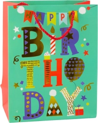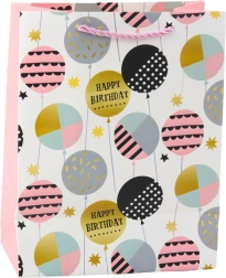 A stylish birthday gift bag made of sturdy decorative cardboard in a modern, cheerful design. It stands out with vibrant colors, “Happy Birthday” inscriptions, and balloon motifs. Thanks to the durable material and cord handles, it safely carries even heavier gifts. The universal size of 23 × 18 × 10.5 cm fits small to medium surprises.