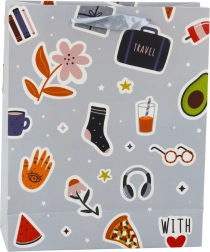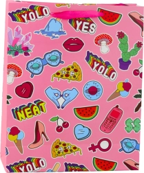 A stylish gift bag with a sticker motif and bold colors gives any present a modern and playful vibe. Made from durable decorative cardboard and finished with sturdy cord handles for comfortable carrying. Ideal for birthdays, get-togethers, and gifts for teenagers.