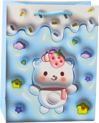 A cute paper gift bag with a teddy bear motif in pastel colors, perfect for wrapping gifts for kids and loved ones. It stands out with a quality decorative cardstock, playful fruit, stars, and “icing” motifs, and sturdy cord handles for safe carrying. With dimensions of 23 × 18 × 10.5 cm, it’s ideal for toys, sweets, and small gifts.