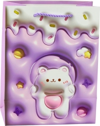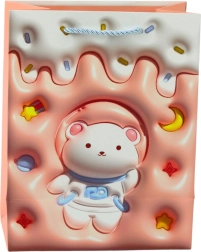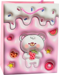 This decorative cardstock gift bag enchants with a pastel palette in pink, blue, orange, and purple. A cute teddy bear with stars and fruity details creates a 3D effect that makes it look as if the bear is popping out of the bag. The stylish look is complemented by color-coordinated cord handles for comfortable and secure carrying.