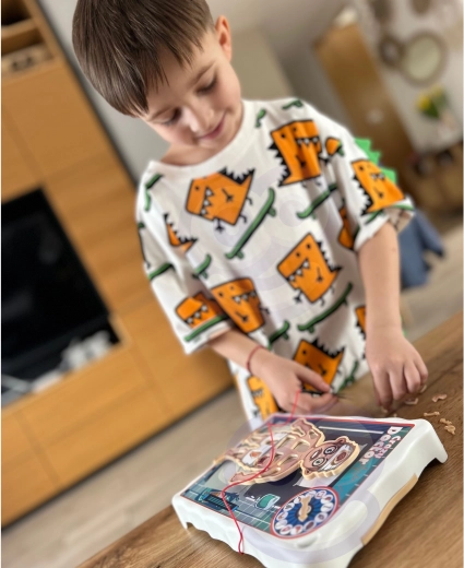 Safe manipulators and colorful organ pieces let children learn carefulness without risk – touching the edge triggers a vibration and it’s the opponent’s turn.